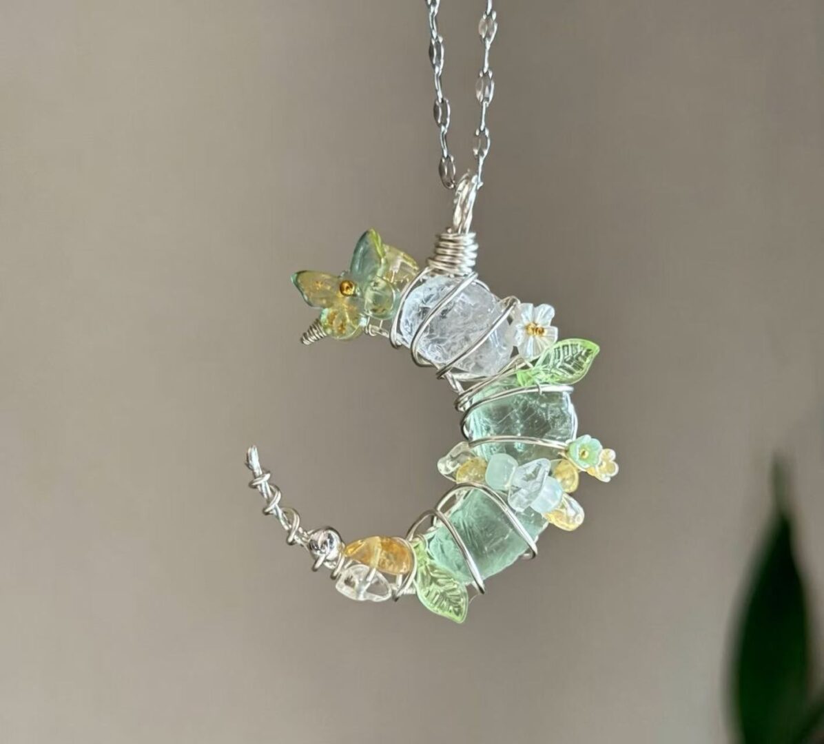 Green Fluorite & Clear Quartz Crescent Moon Pendant: The Wood-Metal Element Amulet For Clarity, Abundance & Energy Cleansing